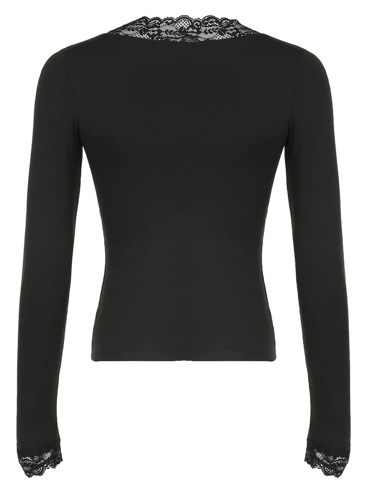A stylish and sophisticated top that blends vintage and modern aesthetics, perfect for adding a touch of chic to any casual outfit. With its lace patchwork detailing and slimming fit, this long sleeve tee offers both comfort and a fashion-forward look.